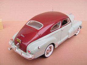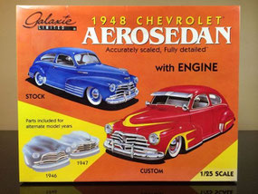 Um so größer war dann die Freude in der Modellbauscene, als die Firma Galaxie Limited, 1998 genau dieses Fahrzeug als Plastik-Kit auf den Markt brachte. Erschienen als Fastback-Limousine und in einem separaten Kit als Sedan-Delivery (Lieferwagen). Das Tolle an dem Bausatz ist, dass man das Modell als drei verschiedene Jahrgänge bauen kann, nämlich 46/47/48. Es liegen dem Bausatz die nötigen Chromteile, wie andere Embleme, Haubenfiguren und Kühlergrills bei. Also musste man sich drei dieser Kits nach Hause holen, um alle drei Jahrgänge bauen zu können. Der Bausatz ist sehr gut detailliert und beinhaltet sogar Fotoätzteile.