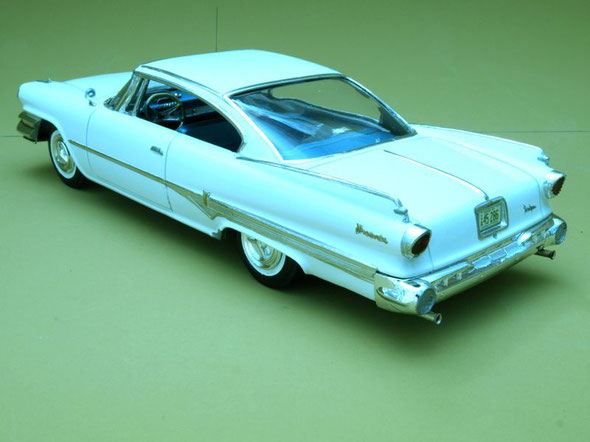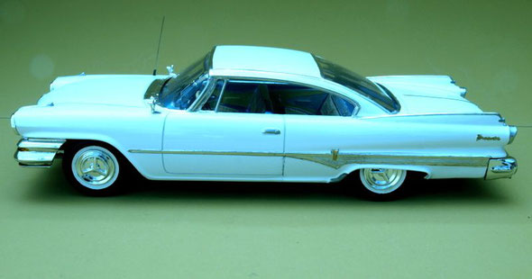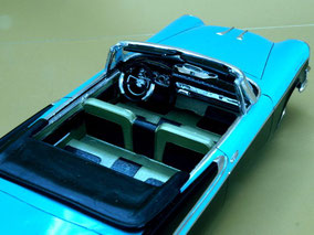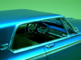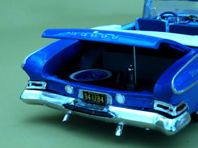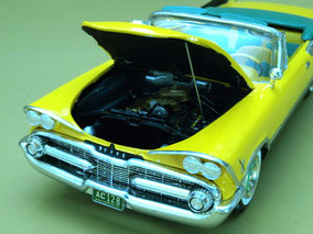 Im Zuge dieses Umbaus wurden auch gleich die Motorhaube und der Kofferraumdeckel ausgeschnitten, um sich beweglich gestalten zu lassen. Das dadurch notwendig gewordene, detaillierte Fahrwerk einschließlich des Motors stammt vom 1957er Chrysler 300 C von AMT, das ohne größere Änderungen implantiert werden konnte. So entstand auch hier ein Modell, das zwar nicht bis in das letzte Detail stimmt, dessen Gesamteindruck aber durchaus zu überzeugen vermag.