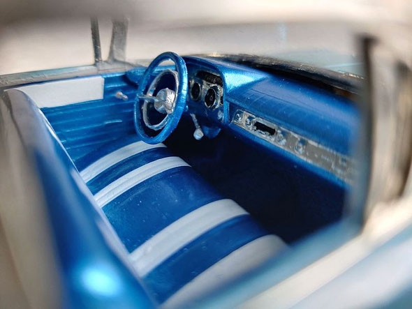 Beim Interieur habe ich mich für ein etwas dunkleres Blau-Metallic entschieden, mit weißen Streifen auf den Sitzen, die ich übrigens mit Streifendecals gemacht habe.