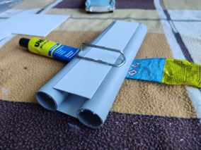 Die seitlichen Tuben, die die Scheinwerfer und die Rücklichter aufnehmen sollten, sind aufgeschnittene Evergreen-Röhrchen, mit Plasiksheet dazwischen, in die richtige Form gebracht.