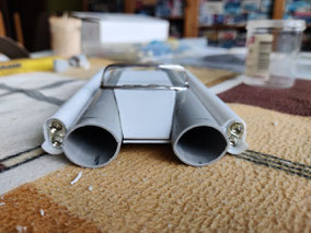 Vier zurechtgeschnittene Evergreen-Platten wurden dann jeweils oben und unten zwischen die Röhren geklebt. Eine irre Messerei, dass auch der Abstand vorne und hinten gleich ist!