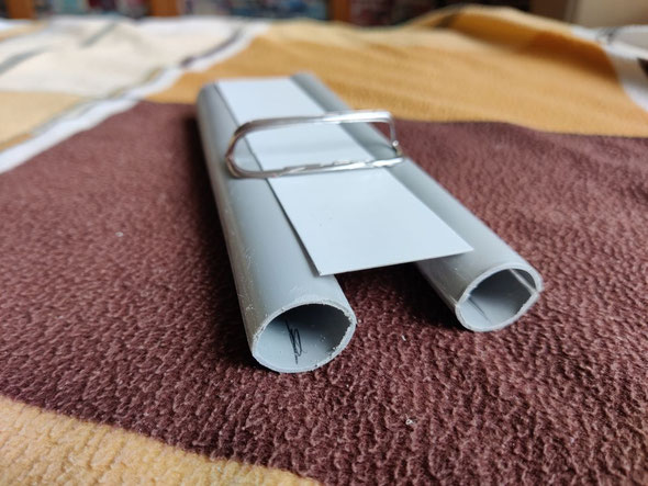 Das Rohr wurde in zwei gleichlange Stücke gesägt, diese wurden dann der Länge nach aufgeschnitten und dann um ca. 3mm abgeflacht wieder zusammengeklebt um eine leicht ovale Form zu bekommen.