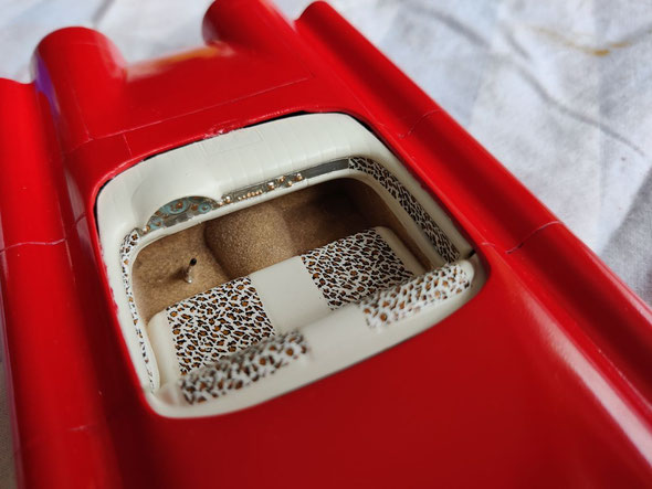 Kleine Anekdote zwischendurch: Da ja das Interieur von unten eingesetzt werden musste und die Karosserie von unten gesehen, vorne und hinten gleich aussieht, habe ich doch das Innenteil verkehrt herum eingeklebt! Zum Glück ist es mir noch rechtzeitig aufgefallen!
