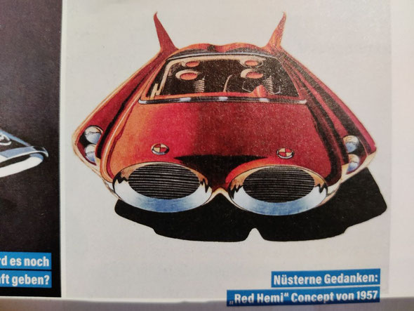 Diese Redensart stimmt tatsächlich! Ich habe vor einiger Zeit schon völlig unbedarft in einer US-Car-Zeitschrift geblättert, in der ein Bericht über den ehemaligen Auto-Designer G. Gordon Davis abgedruckt war. Darin auch einige Skizzen und Zeichnungen von ihm, von denen mich eine aus dem Jahr 1957 sofort in Schnappatmung versetzte. Eine rote Flunder mit zwei ovalen Kühleröffnungen, seitlich daneben die Scheinwerfer und hohen, spitzen Heckflossen. Das Teil hatte den Namen „Red Hemi Concept“.