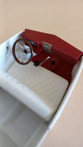 Im Innenraum wurde auch einiges verändert. Die etwas zu große Sitzbank aus der Ersatzteilbox - keine Ahnung mehr wo die ursprünglich herstammt – musste ebenfalls in Höhe und Breite gekürzt bzw. verschmälert werden. Das Custom Armaturenbrett ist aus dem AMT-Bausatz, das Decal für die Instrumente aber vom Revell-Ford. Das Fahrwerk erfuhr eine dezente Tieferlegung. Räder und Achsen steuerte der 53iger Ford Crestline von Welly bei.
