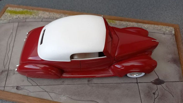 Dann fiel mir ein Bild von einem Hot Rod aus einem alten Scale Autoheft ein. Dunkelrot mit weißem, leicht gechoppten Custom Dach. Nur ein Bild von der rechten Seite, ohne weiteren Text dazu. Normalerweise hab ich mit Hot Rods nicht viel am Hut, aber der gefiel mir.